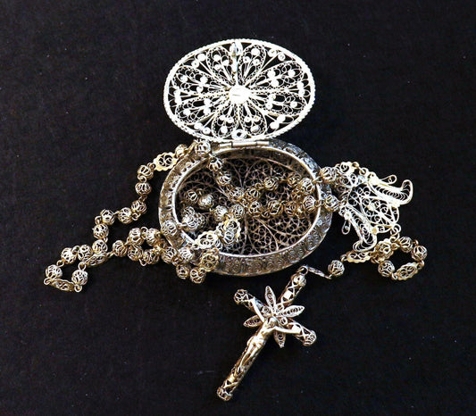 Vintage Set Filigree Sterling Silver Catholic Spanish Rosary and oval Box - Large and V. Rare