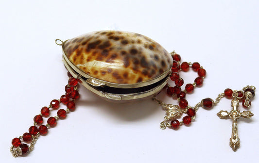 Vintage Garnet and Sterling Catholic Rosary in Tiger Cowry Shell box – Rare and Charming - 1920's