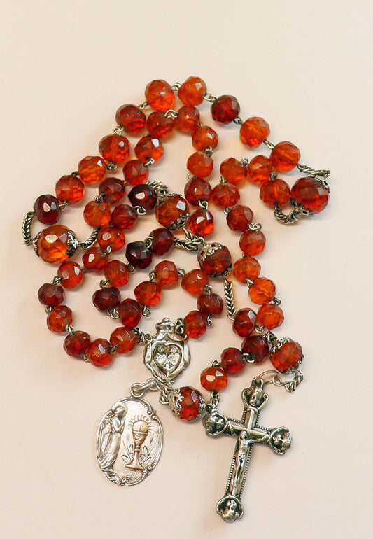 Vintage Catholic Rosary Faceted Gold Baltic Amber & Sterling w Open Work Silver and Gold 1st Communion Medal DD 1905 Extreme Rarity