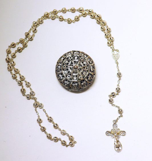 Vintage Set Sterling Silver Catholic Rosary and Round Box - Rare