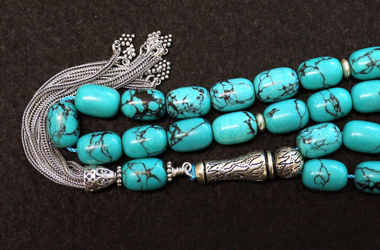 Luxury Rosary Tesbih Veined Barrel Turquoise & Sterling Rare Collector's Choice